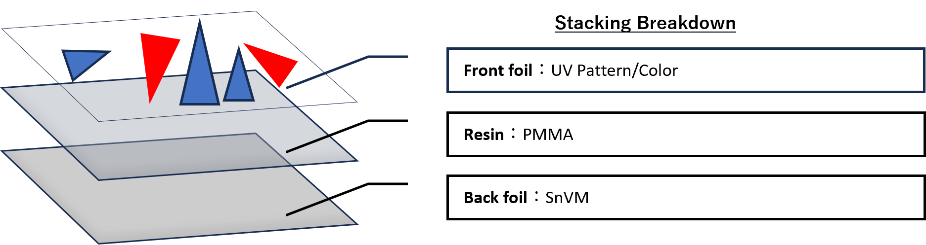 表側と裏側に異なる加飾のインモールド箔を入れることで、成形樹脂の肉厚を通し、奥行きや深みを表現できます。