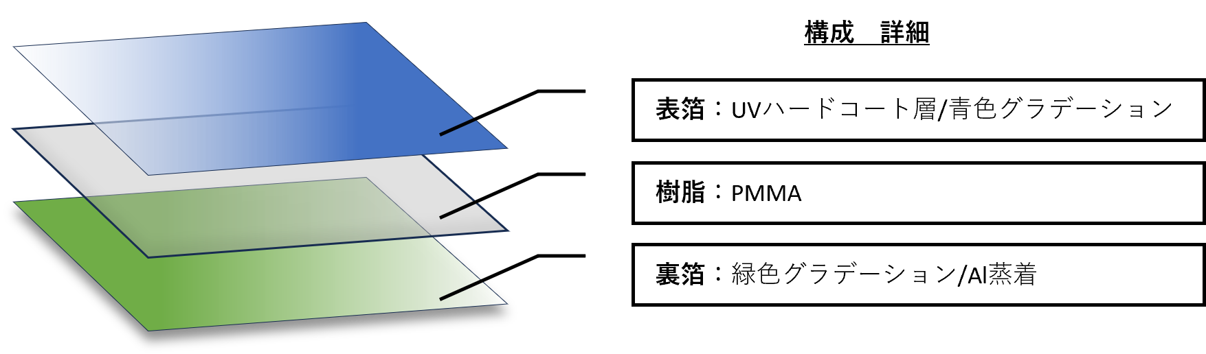 表側と裏側に異なる加飾のインモールド箔を入れることで、成形樹脂の肉厚を通し、奥行きや深みを表現できます。