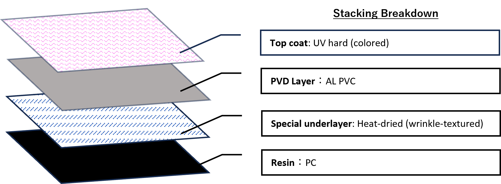 さらに蒸着にて金属感を出し、その上からトップコートで色を付けることで微細な模様がある金属のような
