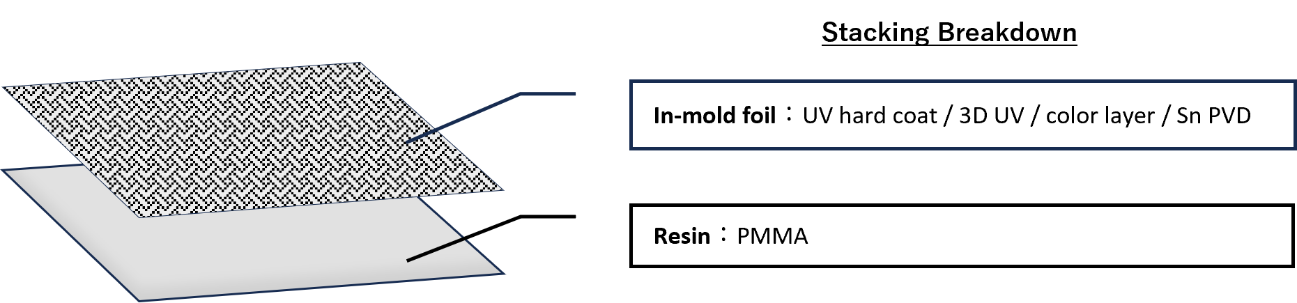 In this process, a film pre-printed with the design (In-mold foil) is inserted into the mold, and the heat and pressure generated during injection molding transfer the design onto the component simultaneously with molding.