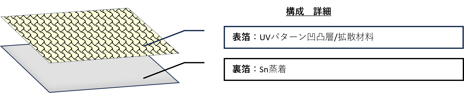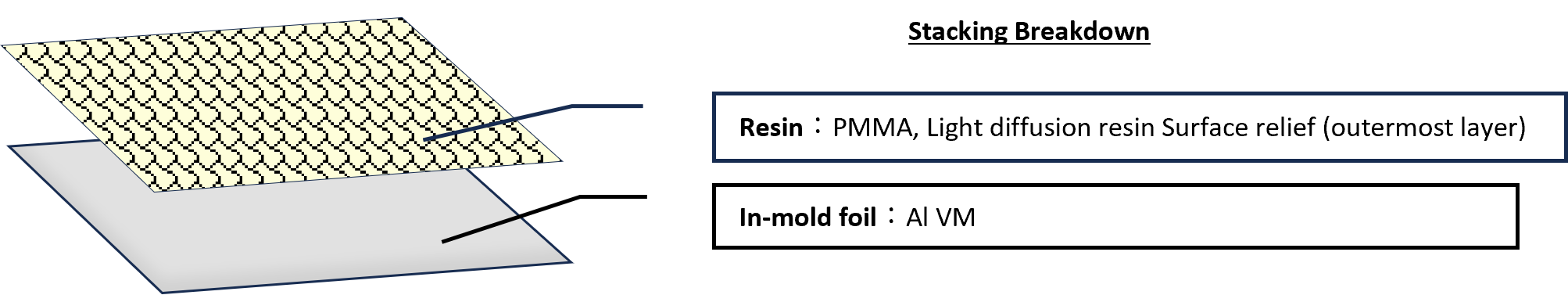 パターン凹凸シートを表側にインサートし、裏面は蒸着のインモールド箔を入れ、光拡散材で成形行いました。